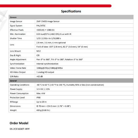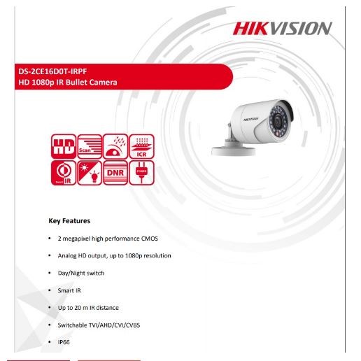 HIKVISION TURBO HD 2MP/1080P Bullet Camera DS-2CE16D0T-IRPF/IPF